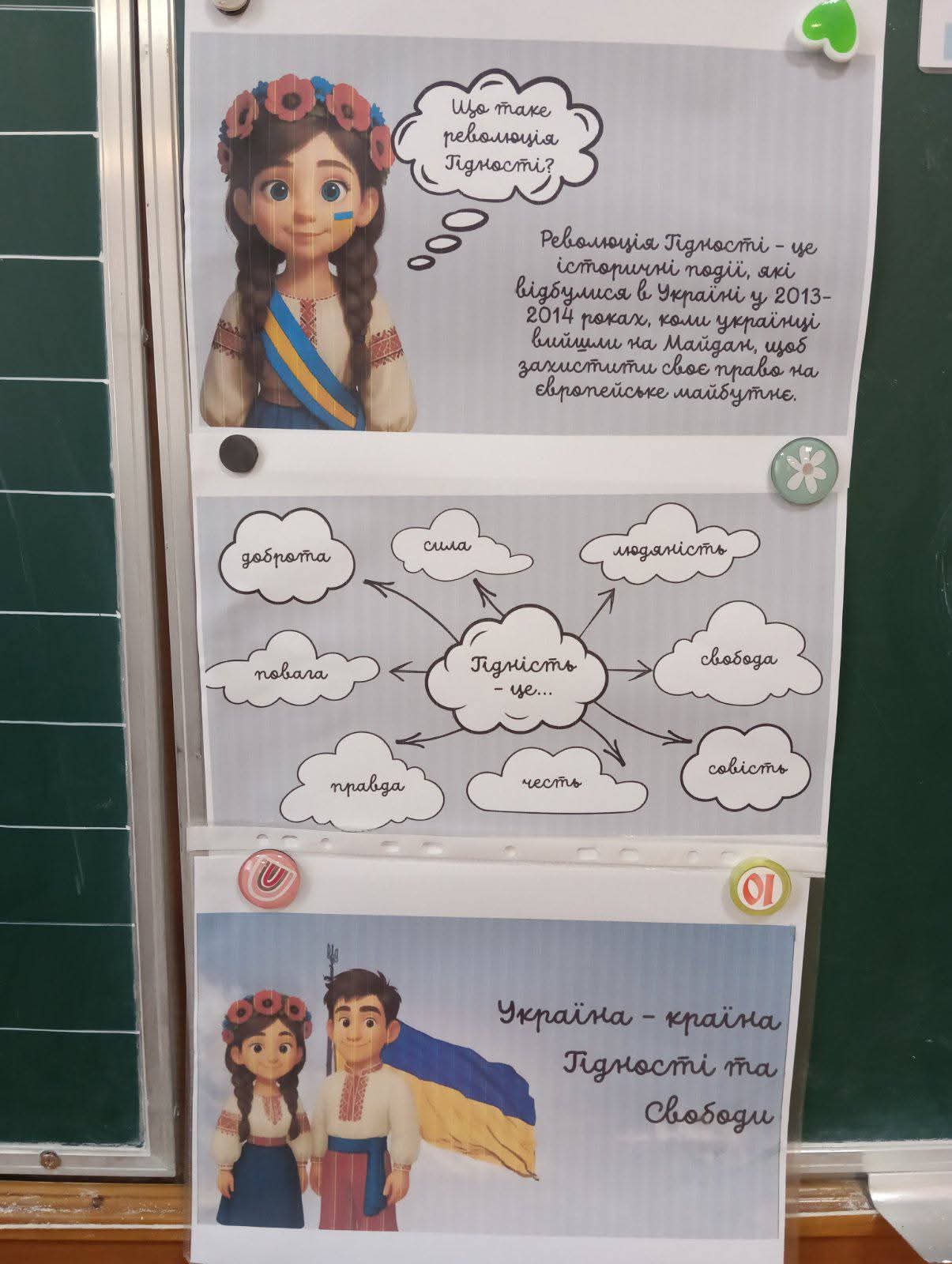 Сьогодні в гімназії міста Калинівки відзначили День Гідності та Свободи . 💙💛 Учні та вчителі вшанували мужність, громадянський подвиг, патріотизм людей, які відстоювали право України на свободу та демократичний вибір. У гімназії було проведено низку виховних заходів під гаслом" Україна: формула гідності ". Вчителем української мови та літератури Пасічняк Вірою Володимирівною для учнів 5-9 класів проведено патріотичний захід "День Гідності та Свободи ". Учні дізналися про хронологію подій на Майдані, переглянули документальні кадри. Учні 6 та 8 класів читали поезії. Вчитель фізичної культури Олійник Ірина Олександрівна поділилась спогадами про події на Майдані. Особливий акцент було зроблено на ключових поняттях : гідність, свобода, відповідальність та патріотизм. Хвилиною мовчання ми вшанували тих, хто пішов від нас назавжди і в дні Революції Гідності , і зараз під час війни та захисту України . Молодші школярі виготовили символічні сердечка, творчі роботи на тему свободи, пограли у гру "Гідно - негідно". Майбутнє у наших руках, і ми здатні його створити разом, спираючись на головні цінності людяності , свободи та честі.