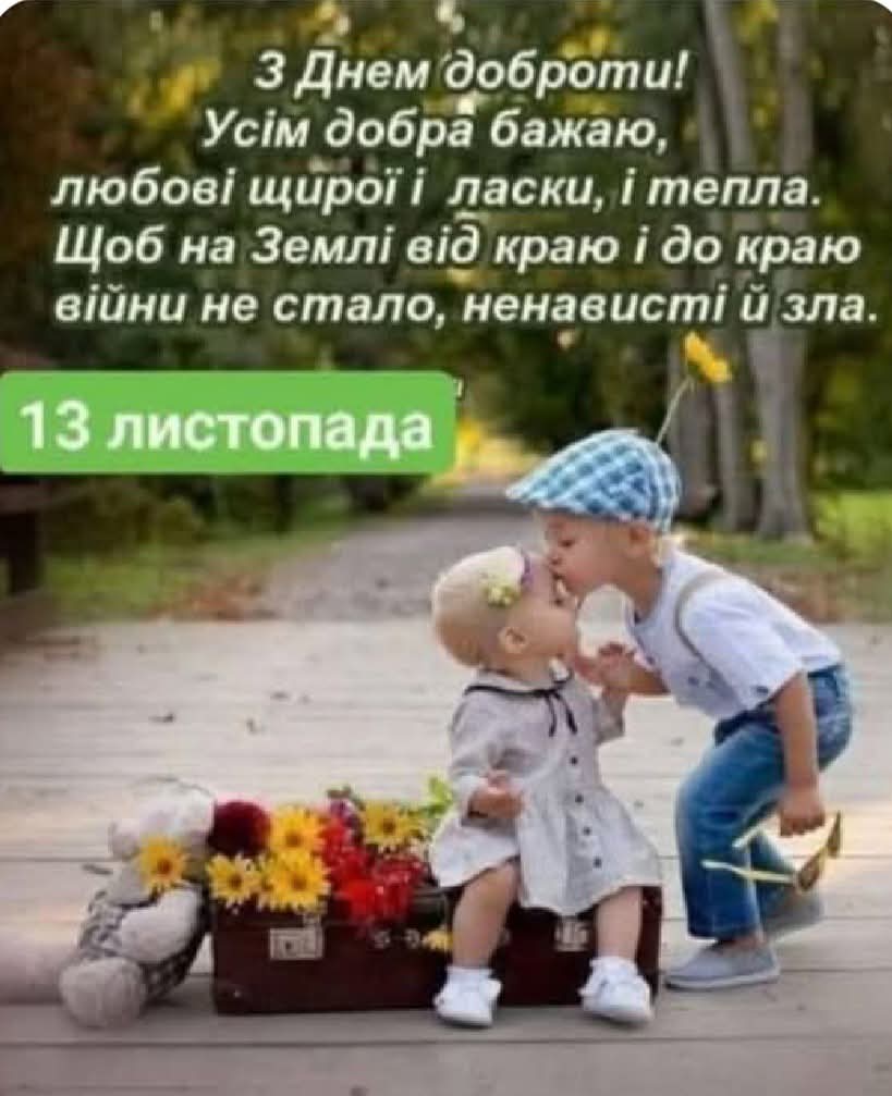 Сьогодні 13 листопада- Всесвітній день доброти. На мою думку, доброта є однією із найголовніших рис людини, а найгіршими рисами є заздрість та злопам'ятність. Доброта - це безкорислива турбота, увага до інших, що проявляється у вчинках, які приносять приємні емоції. У гімназії міста Калинівки сьогодні проведено ряд корисних заходів до Всесвітнього дня доброти. Учні 2 класу (вчитель Лівандовська Ірина Павлівна) виготовляли" торбинки добрих справ", опрацьовували 10 золотих правил доброти, грали в настільну гру" Доброта діє ". Учні 3 класу (вчитель Зоря Наталія Романівна) складали асоціативний кущ до слова" добро ", створили "потяг добрих справ 3 класу", розшифрували афоризми