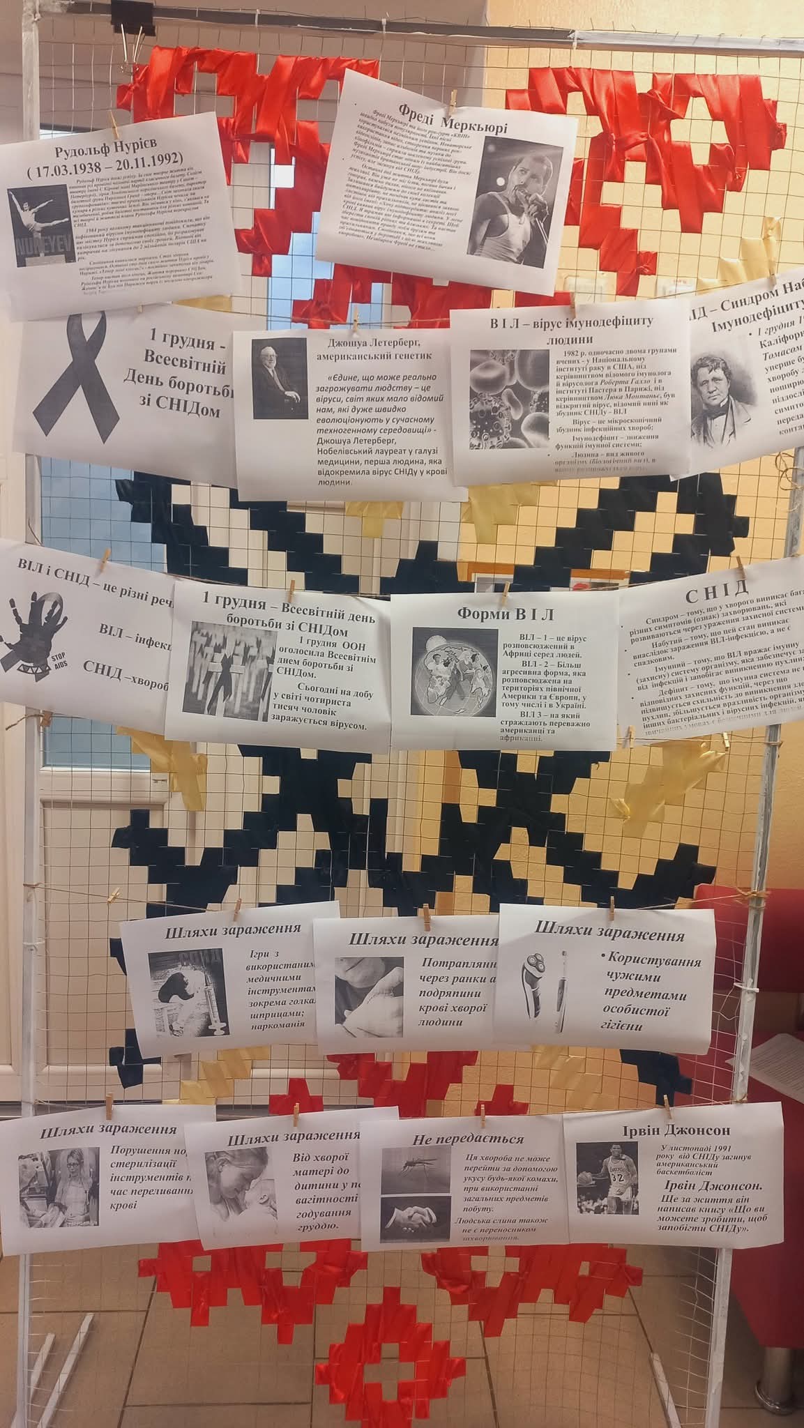 Сьогодні 1 грудня 25-го року у гімназії міста Калинівки директором Оленою Костюк та сестрою медичною Ядвігою Поліщук для учнів 5-9 класів проведено профілактичний захід "Маршрут безпеки " у межах Всесвітнього дня боротьби зі СНІДом. Сьогодні на добу у світі 400 000 чоловік заражується вірусом. Цей день покликаний привернути увагу суспільства до проблем ВІЛ/ СНІДу. Символом цього дня є червона стрічка - знак підтримки, співчуття та пам'яті про мільйони людей, які загинули від СНІДу .Ядвіга Олександрівна розповіла учням, що Віл/СНІД передається через кров, статевим шляхом, внаслідок передачі вірусу від інфікованої матері . Багато знаменитих людей померли від цієї страшної хвороби. Серед них Фреді Мерк'юрі , Рудольф Нурієв, Ірвін Джонсон, Майкл Девіс, Рок Хадсон та інші. Їх та багатьох інших увіковічнили на алеї" Роздолля роздумів ".