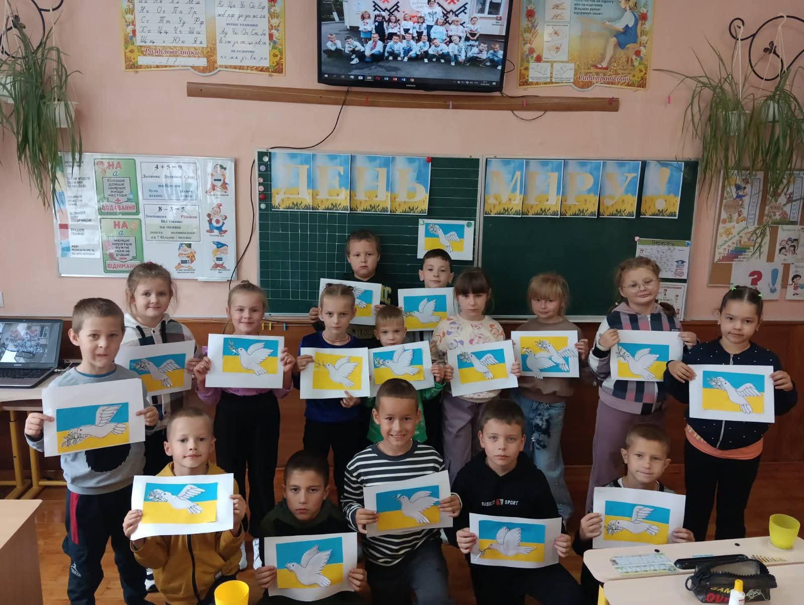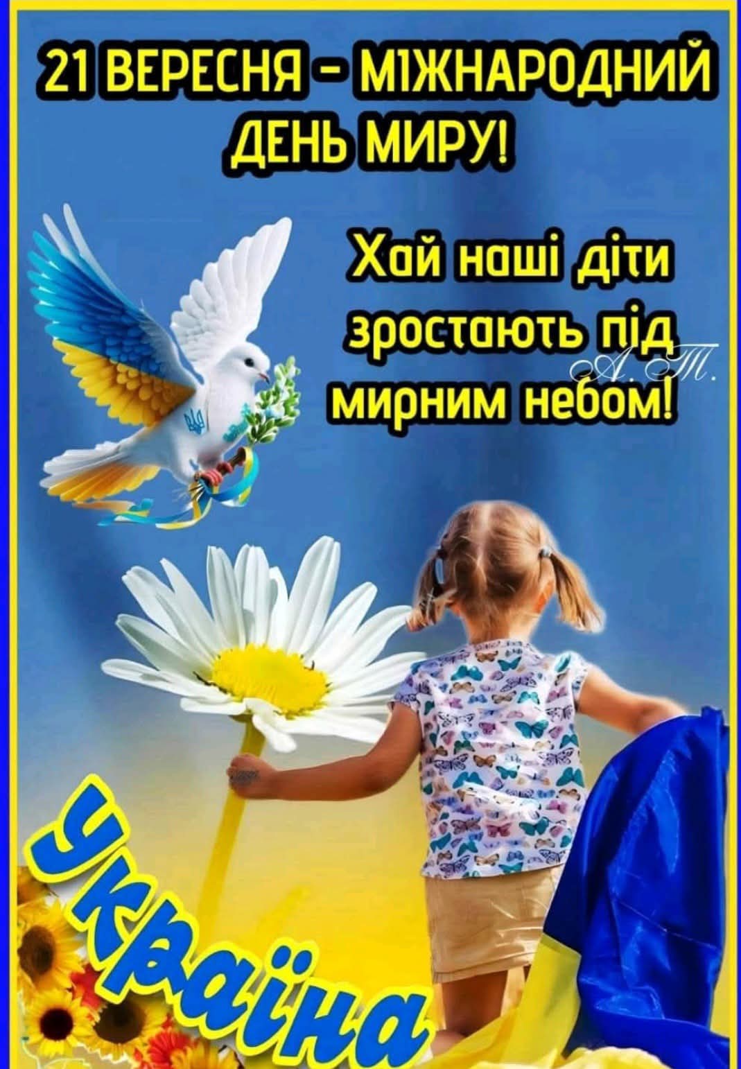 21 вересня- Міжнародний день миру. У гімназії міста Калинівки провели ряд заходів з нагоди цього дня під девізом" Діти за мирне небо України!". Класні керівники провели години спілкування" Мир на землі - радість у родині"," Я за мир в Україні". Учні виготовляли власноруч паперових голубів як символ миру та вивішували їх на калиновій алеї , брали активну участь у конкурсі малюнків на асфальті. Провідали поранених Захисників .